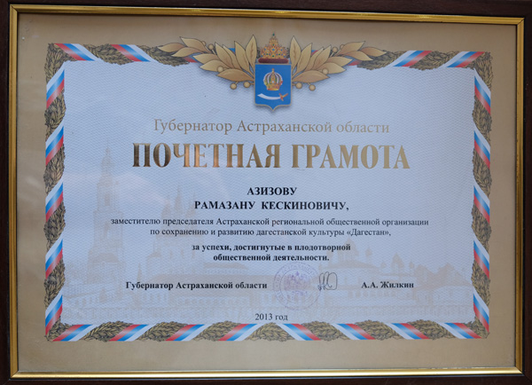 В 2018 году вручена почетная грамота Губернатора Астраханской области за успехи, достигнутые в плодотворной общественной деятельности по сохранению и развитию национальной культуры и укреплению межэтнического согласия и общественной стабильности на территории Астраханской области, награжден Почетной грамотой Министерства по национальной политике республики Дагестан за активную гражданскую позицию, укрепление межнационального и межконфессионального согласия, взаимопонимания между народами Республики Дагестан и Астраханской области»