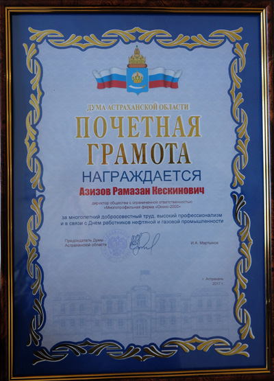 В 2014 году директор ООО МФ «Оникс-2000» отмечен почетной грамотой Губернатора Астраханской области, в 2017 году – почетной грамотой Думы Астраханской области.